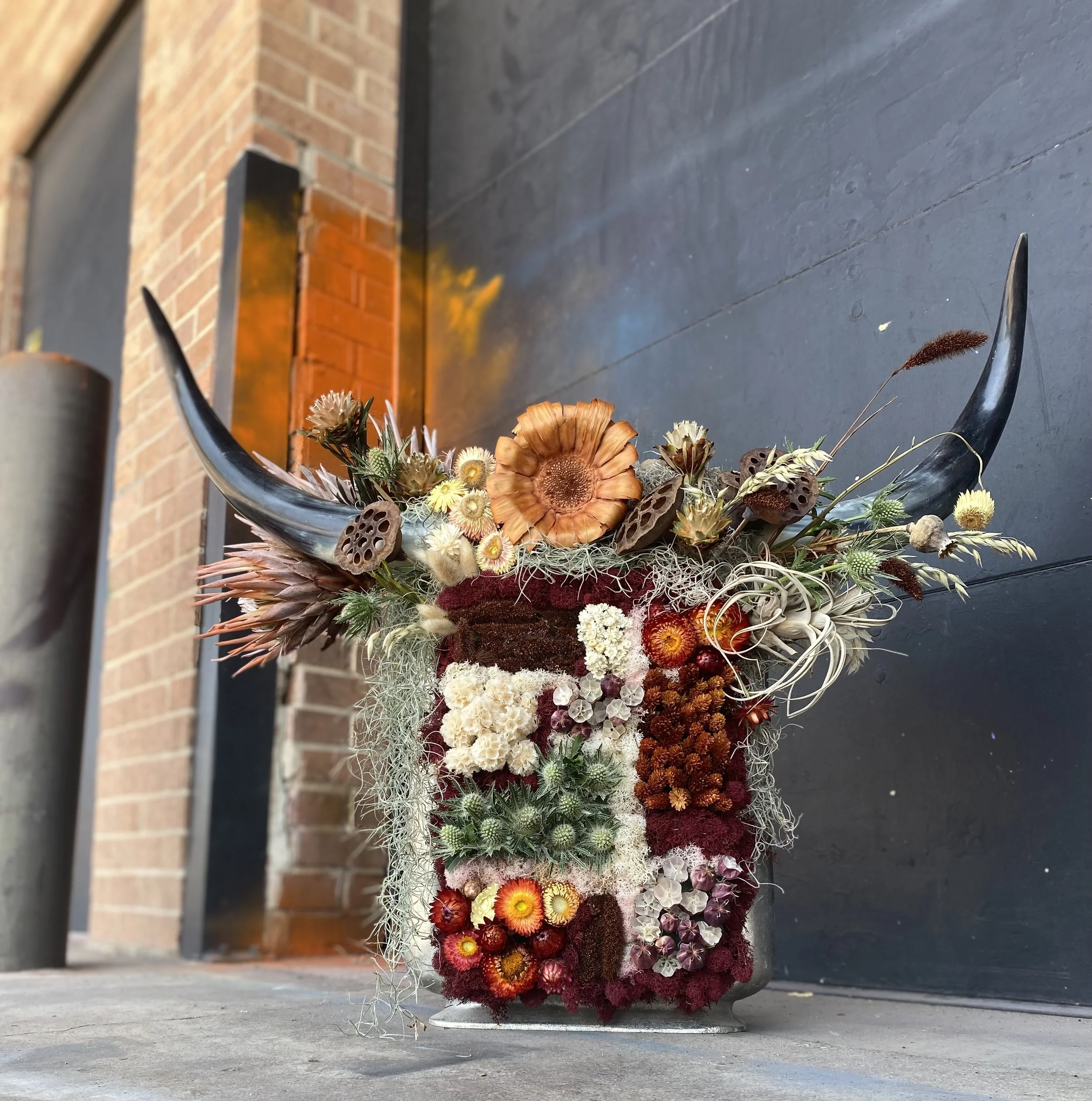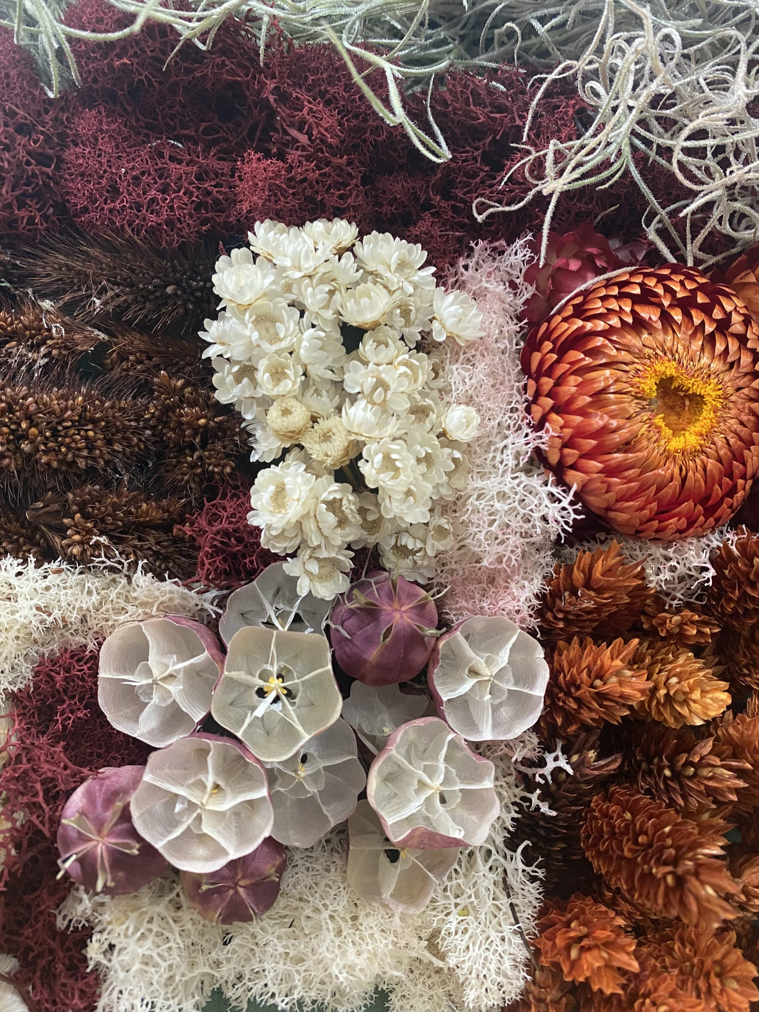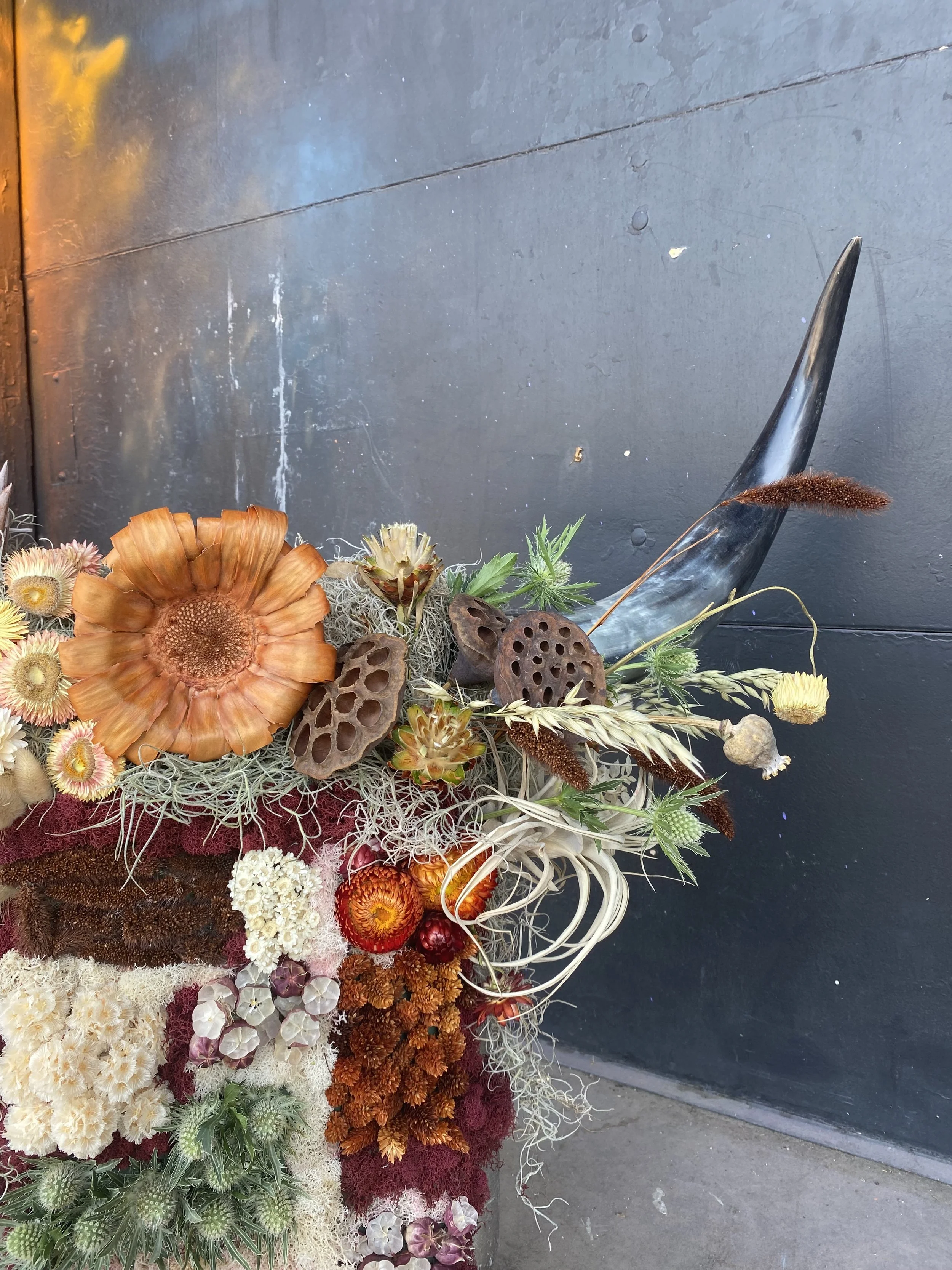 Florals in the design: strawflower, lotus pods, thistle, Spanish moss, dried poppy, millet, xerographic, dried king protea, colored moss, mixed dried elements