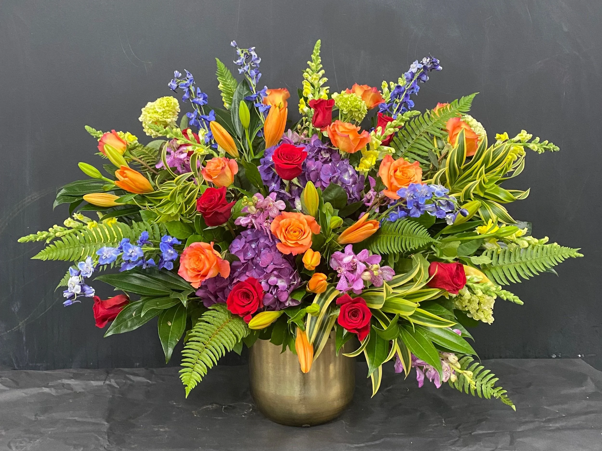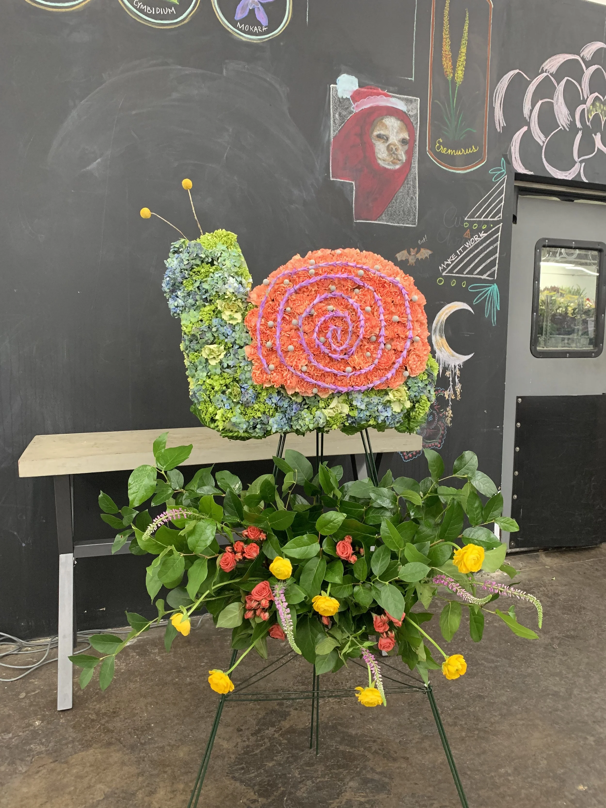 Material used: Carnations, antique blue hydrangea, kale, crespedia, hyacinth blooms, brunia, lemon leaf, ranunculus, spray roses, and veronica.