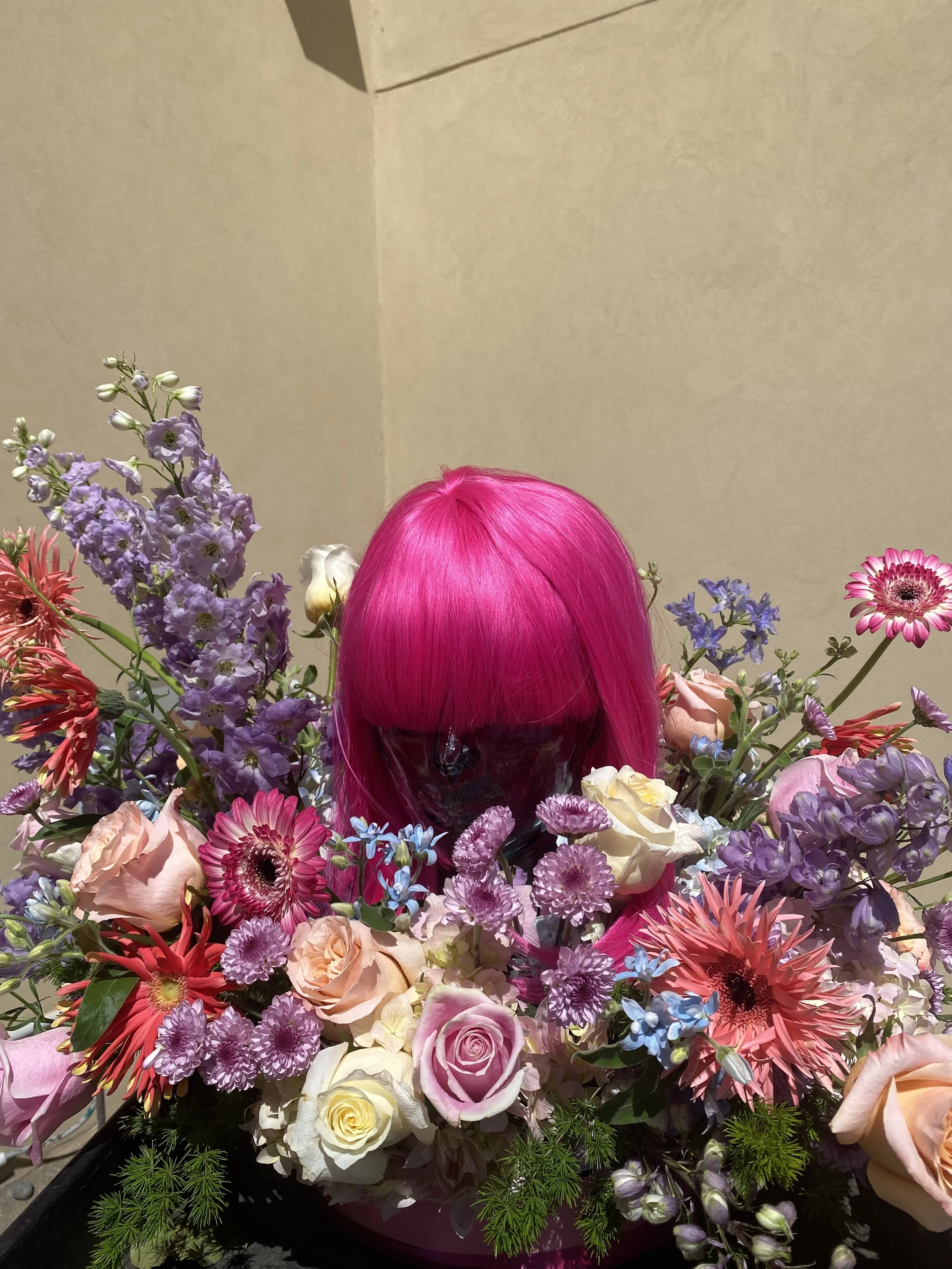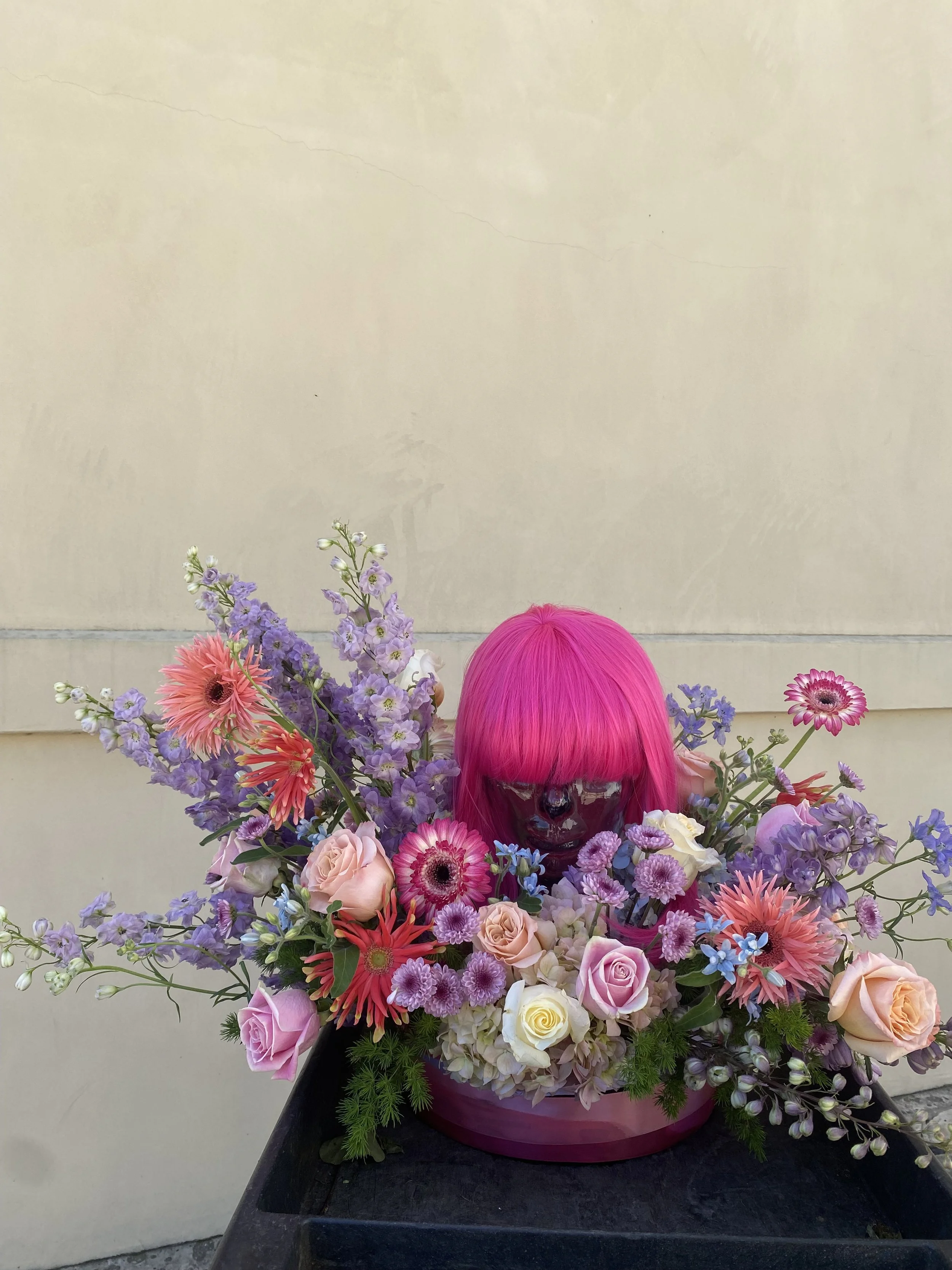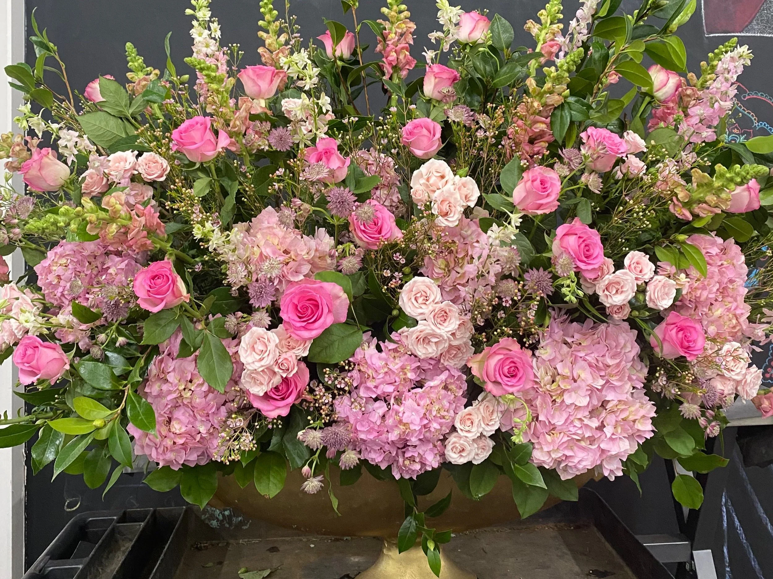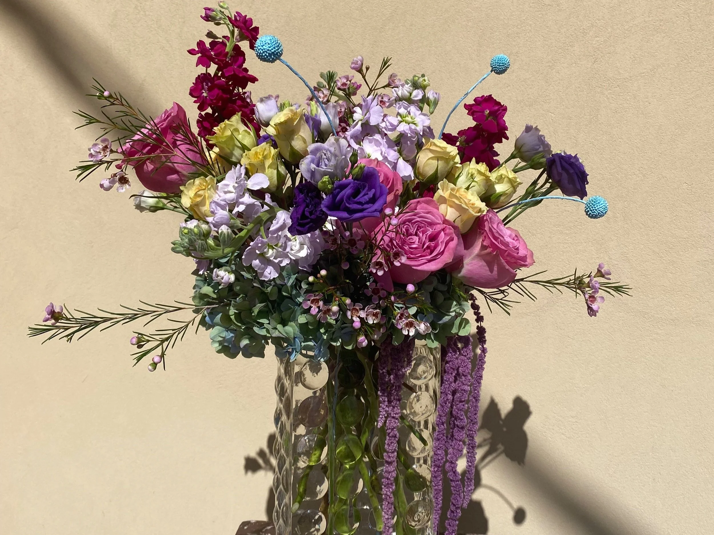 Roses, gerber daises, delphinium, hydrangea, mums, tweedia, and ming fern make up this design,